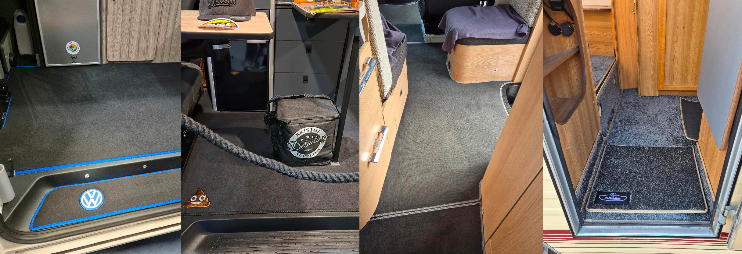 Rugs for Bugs makes and sells carpets and mats for VW campers, vans, beetles, beach buggies and Golfs. We have a wide range of materials and trims in lots of colours so that you can make your vehicle’s interior unique. We also offer custom made mats and can embroider logos, names and other artwork.